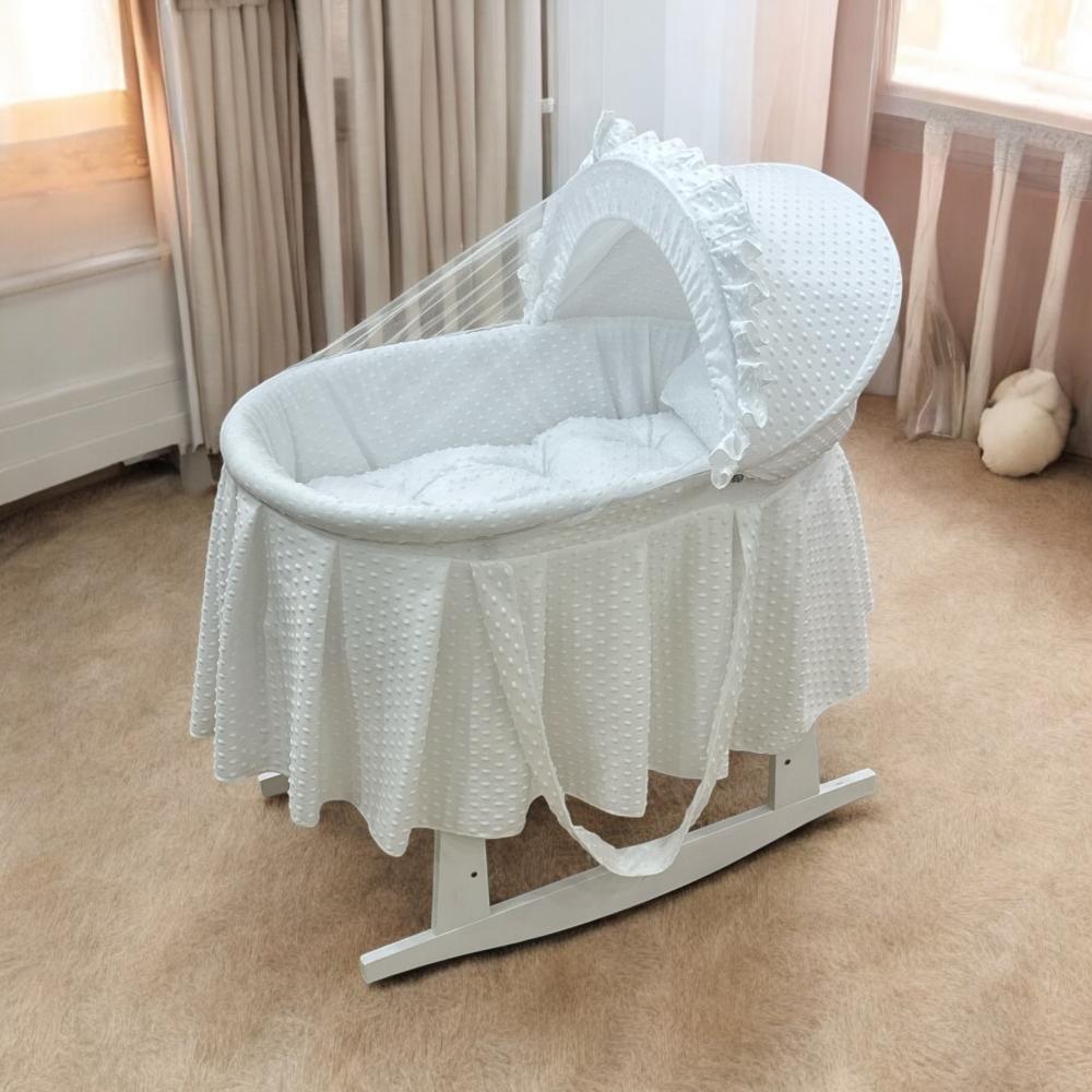 سرير مواليد أنيق بتصميم فاخر ولون أبيض ناعم يمنح لمسة من الهدوء والرُقي لغرفة الطفل. مصنوع من هيكل خشبي قوي قابل للهزّ الخفيف لتنويم المولود براحة، مع طبقة قماش قطنية ناعمة وخامة تنفسية آمنة على بشرة الطفل. مزوّد بمظلّة خفيفة للحماية من الإضاءة، وكشكشة دانتيل أنيقة تضيف مظهرًا فخمًا مثاليًا لاستقبال المولود.